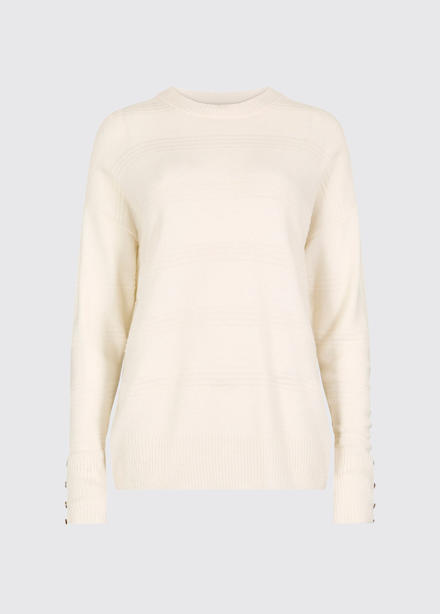 Our Ashfield knit beautifully enhances a classic crew neck style with dropped shoulders and buttoned cuffs. Knitted with a mixed yarn including sustainable bamboo, cashmere and Tencel chosen for exceptional softness and flattering drape, it features a subtle textured stripe throughout. A weekend essential it will be your go-to for both shorts and trouser weather with enough detailing to keep things on the smarter side of casual.