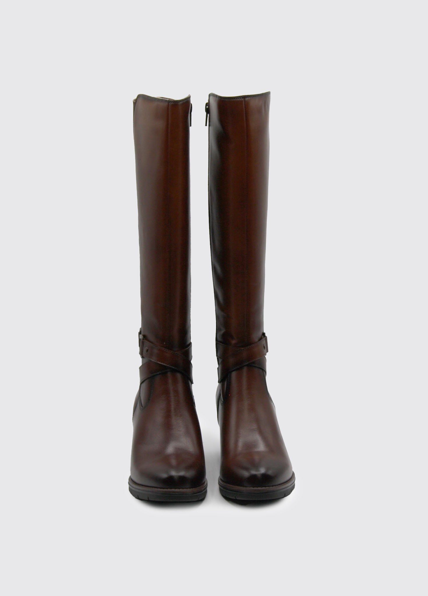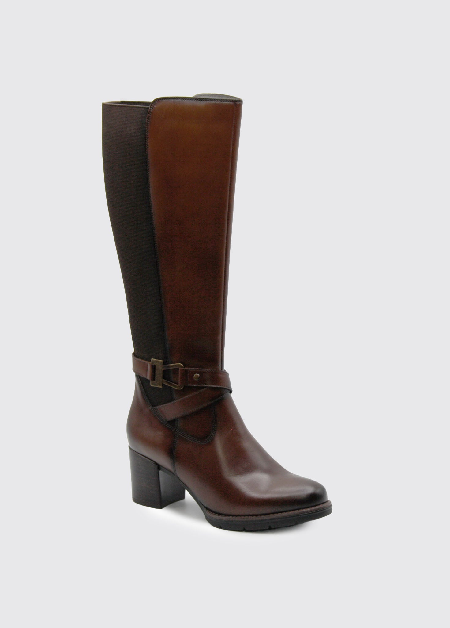 Crafted from smooth leather, the Canker knee-high boot combines practical design with refined style. Elasticated side gussets ensure a comfortable fit, while the side zip closure offers easy on-and-off convenience. The wedge block heel provides stable support throughout the day, and the durable TR sole delivers reliable traction. A distinctive side strap with hardware detail adds a touch of character to this versatile chestnut boot.