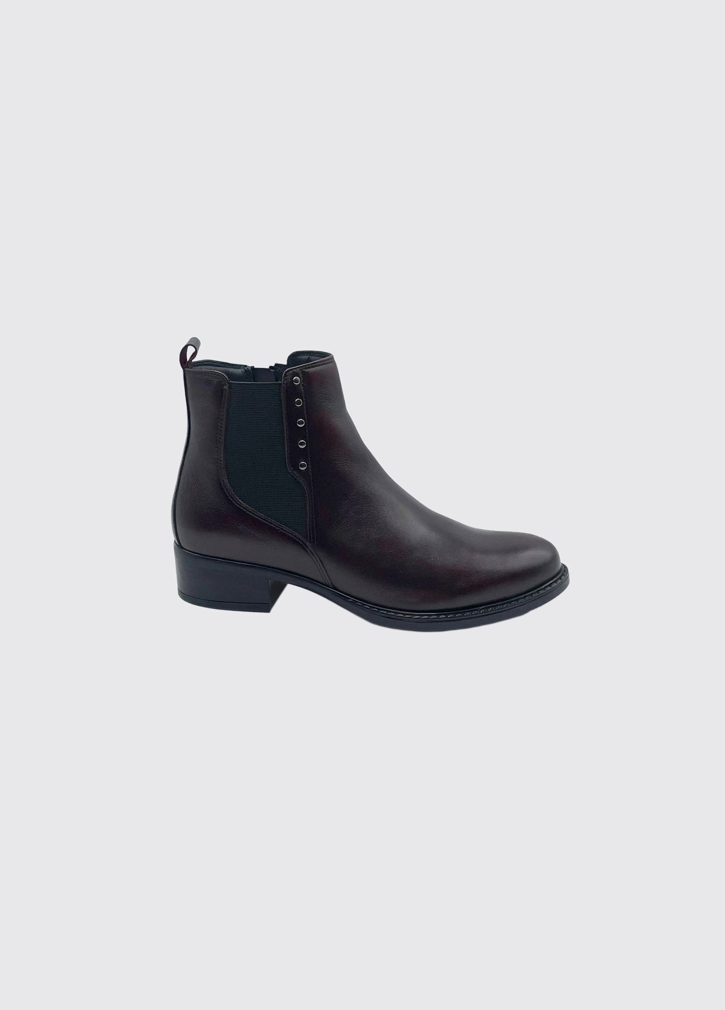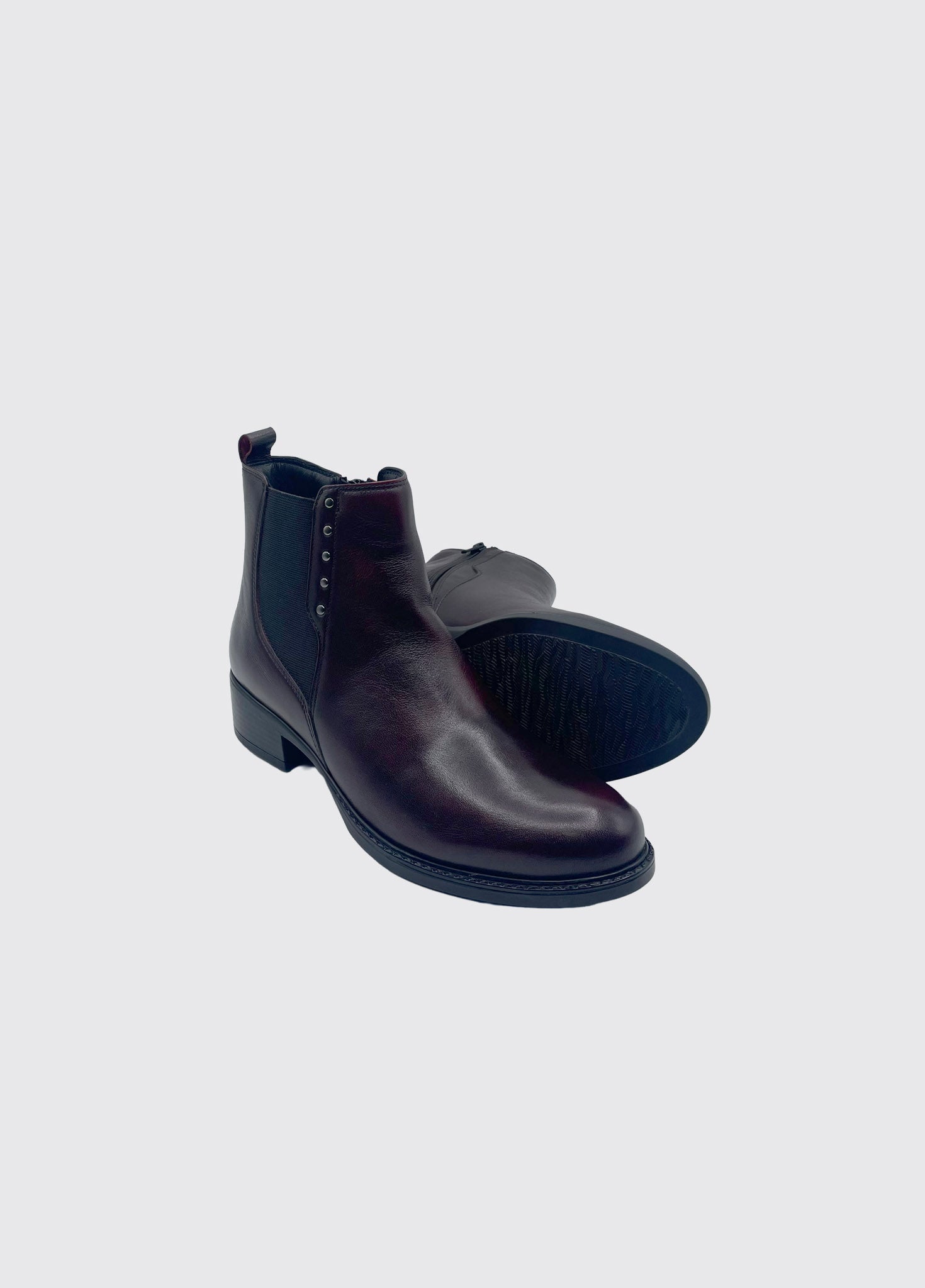 The Crest Short Heeled Boot in Burgundy features a leather upper with elasticated side gussets for a comfortable fit. It includes hardware embellishments and a heel finger pull for easy wearing. The zip closure ensures secure fastening, while the rubber outsole and low block heel provide stability and support for everyday wear.