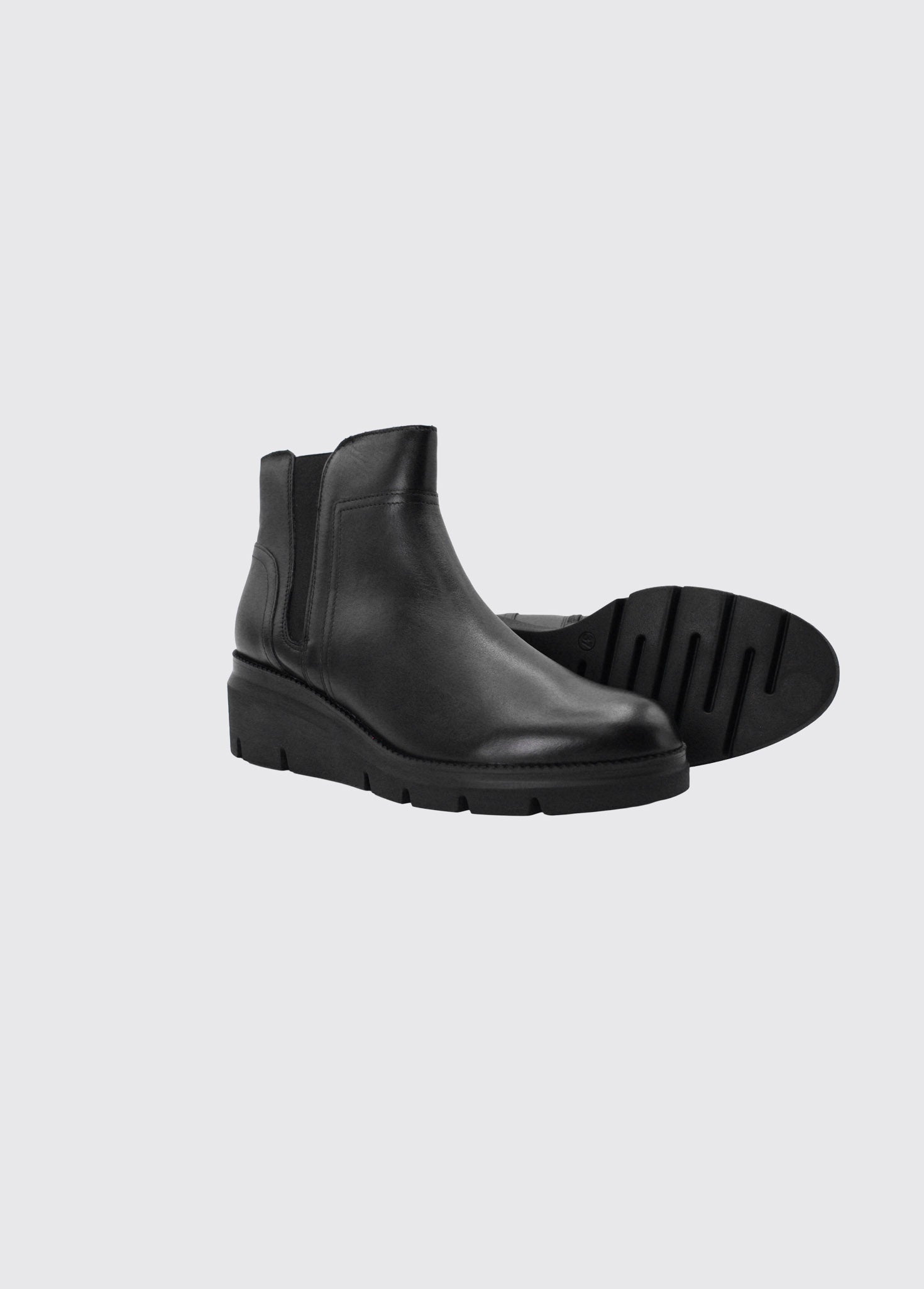 The Eden Wedge Boot black showcases a smooth leather upper paired with elasticated side gussets for a comfortable fit. It features a side zip closure for easy on and off, complemented by an elevated TR sole that offers durability and added support. This boot combines sleek style with practical functionality.