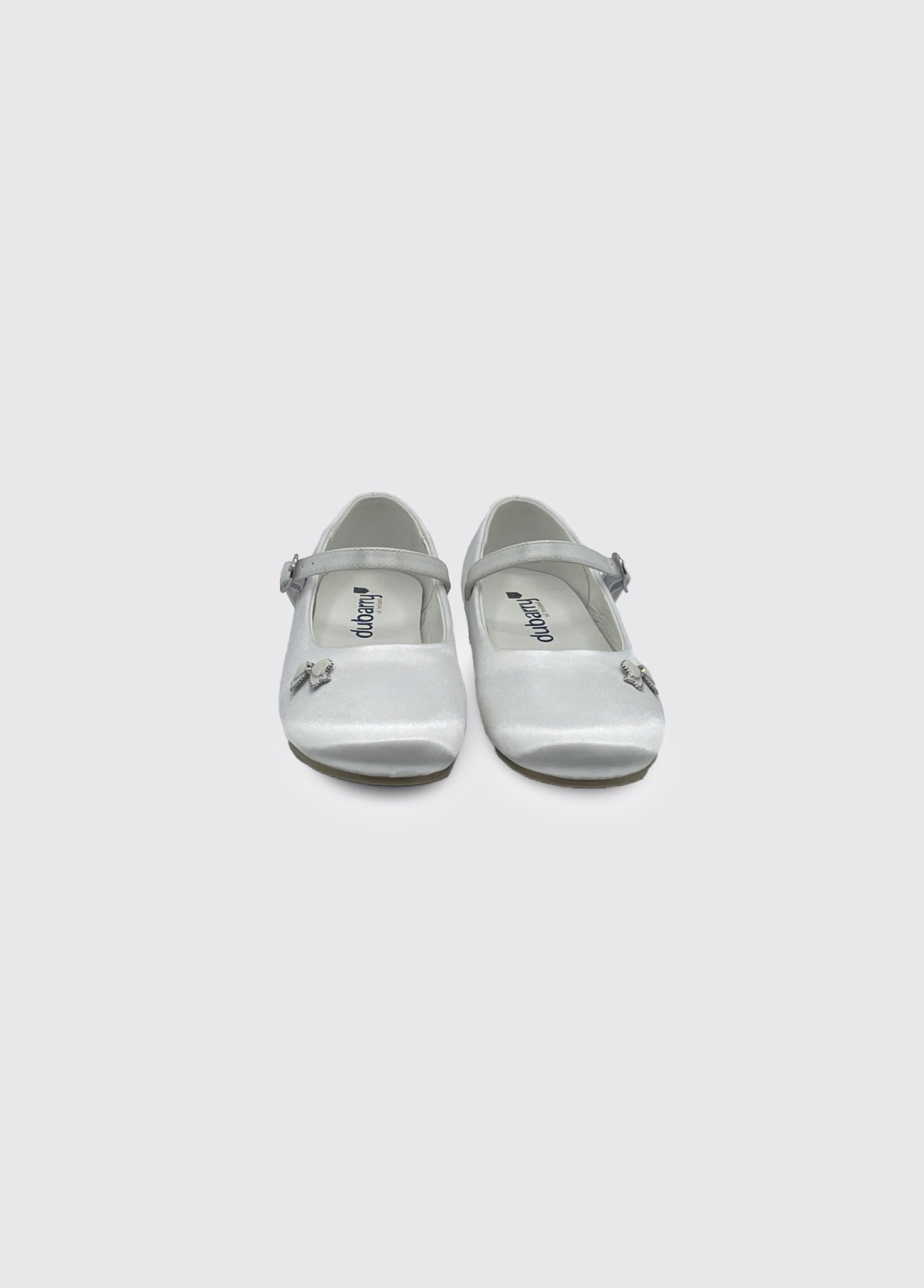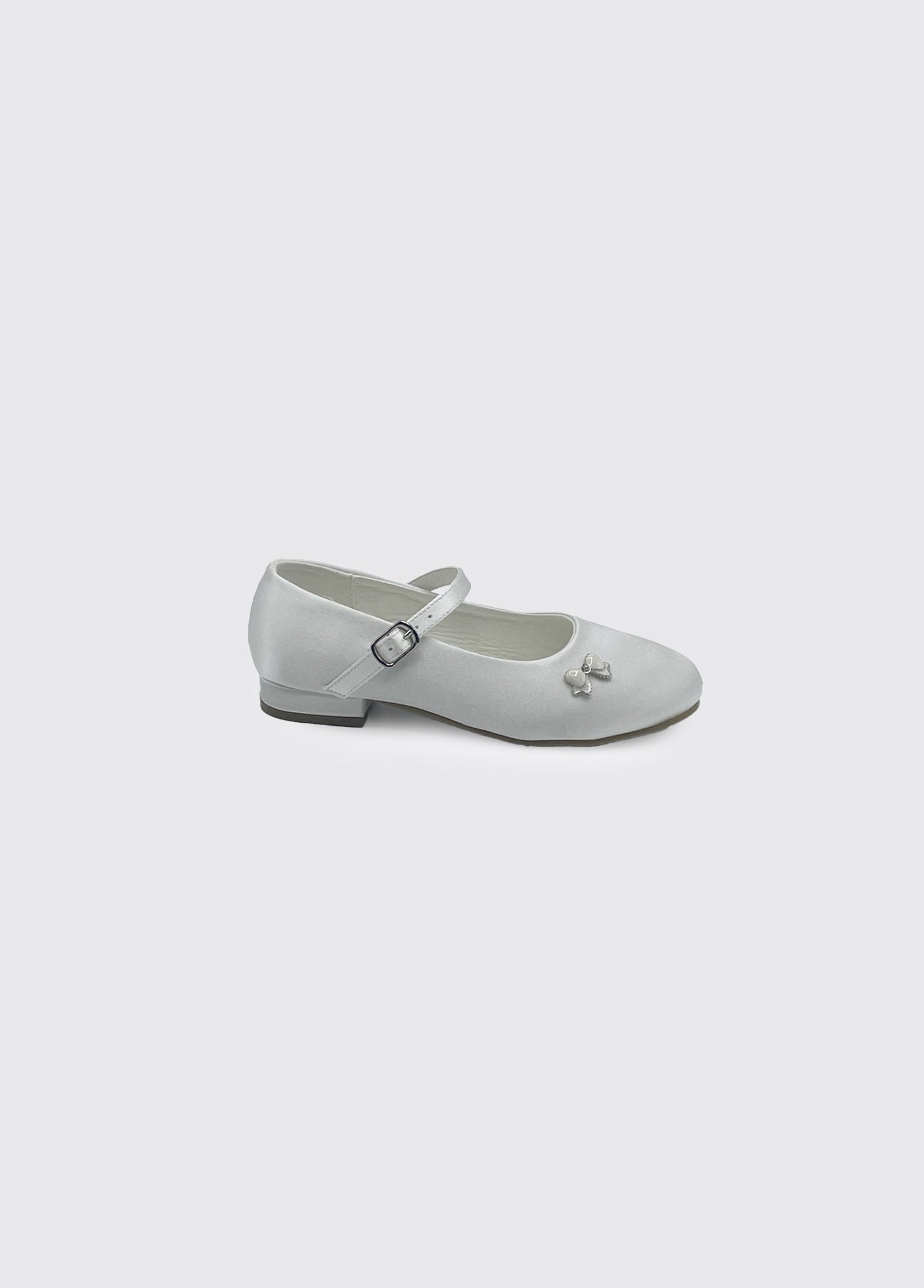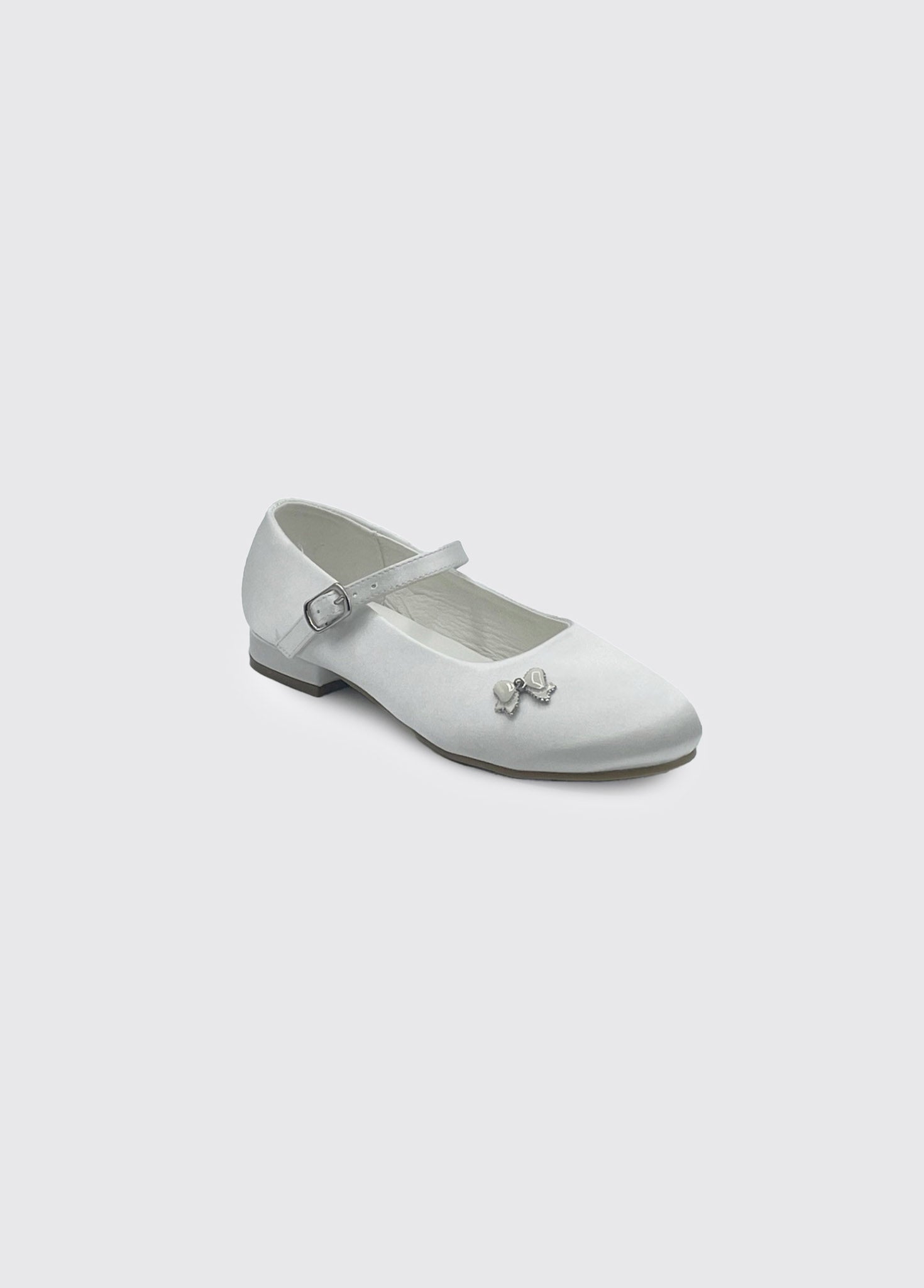 White satin Communion shoes with a classic design, single buckle, and subtle ornament details. Perfect for a special occasion.