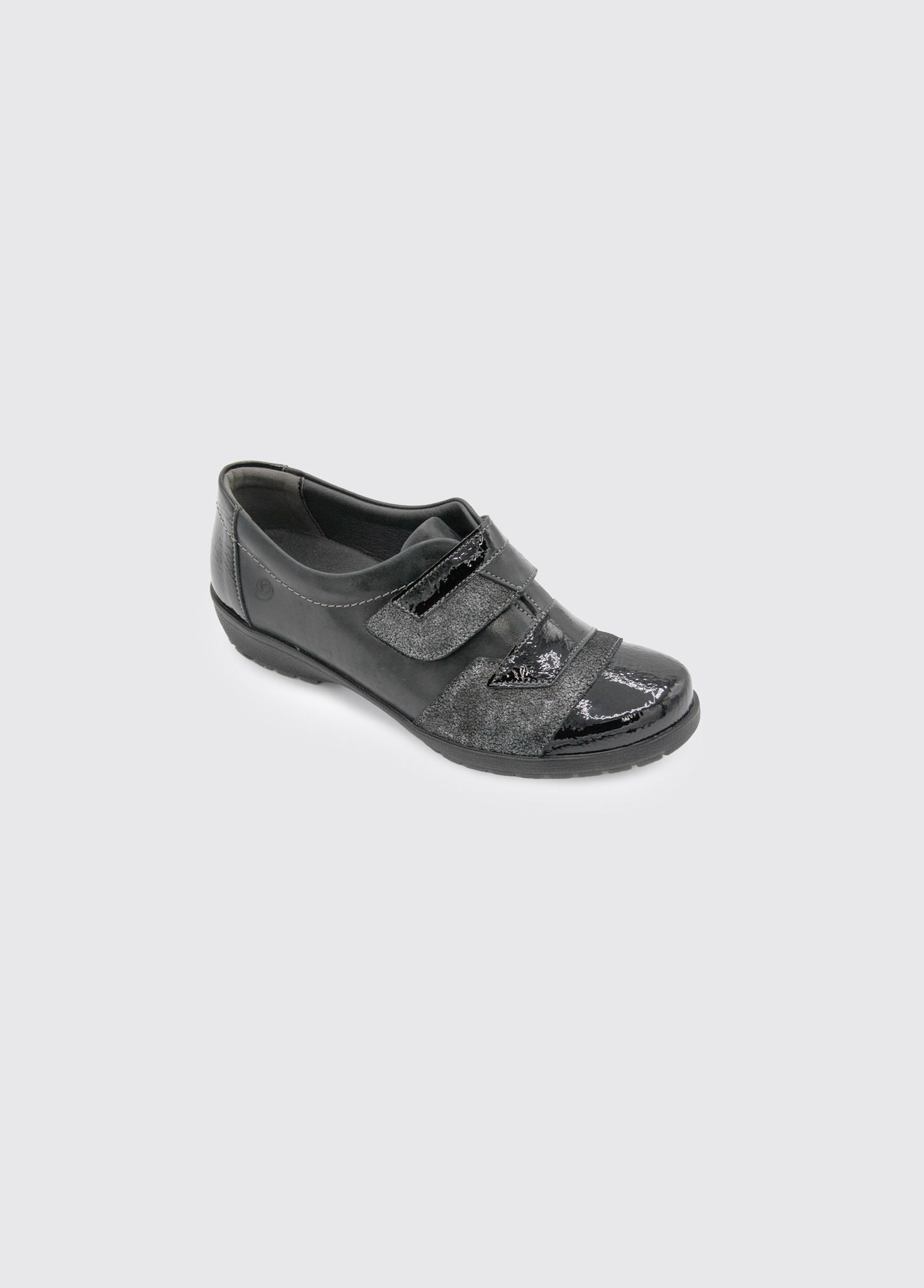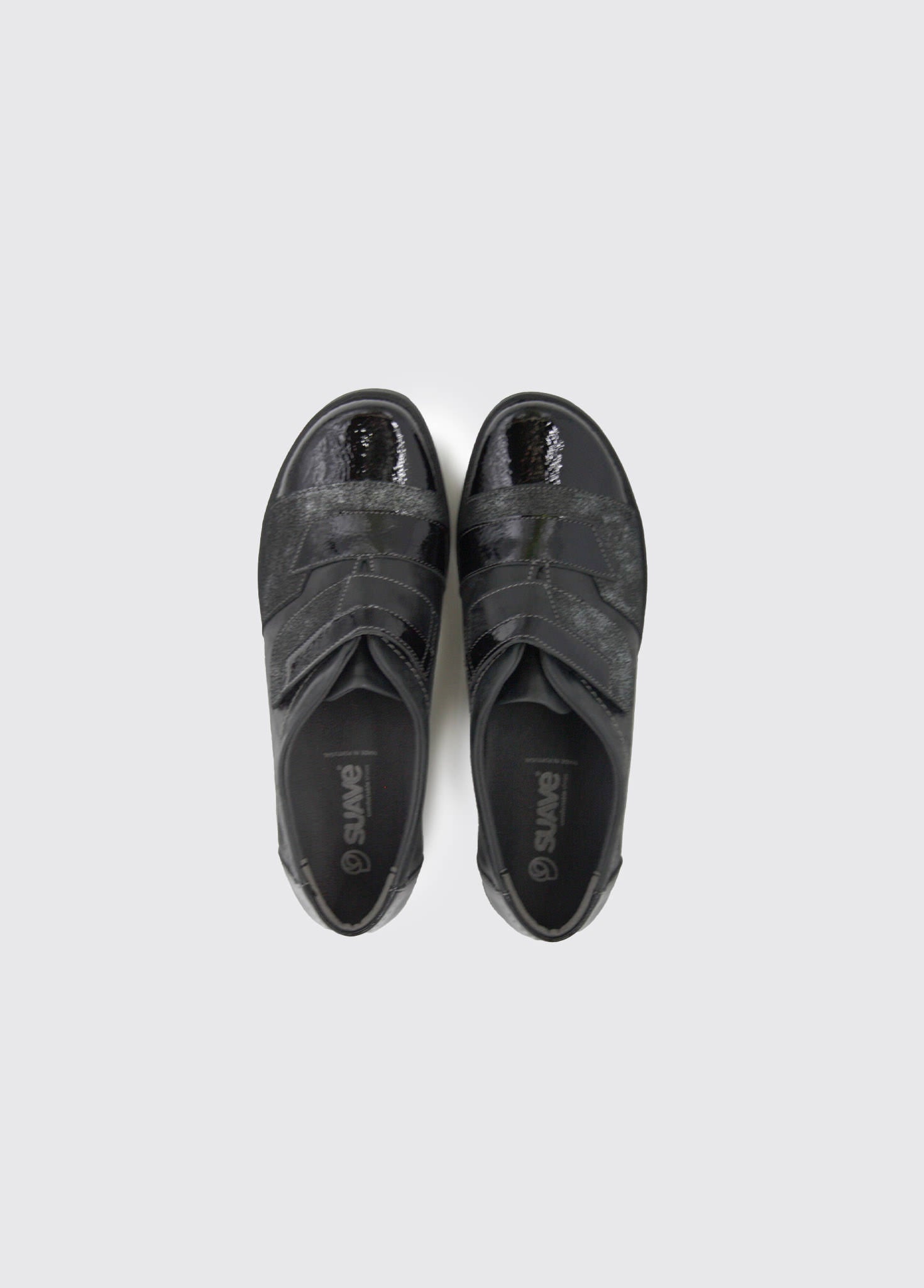 The Gloucester Slip-On Shoe in Black combines a smooth Suave leather upper with a practical velcro strap closure for easy adjustment. Its flexible sole enhances comfort and allows natural foot movement, making it suitable for daily wear.