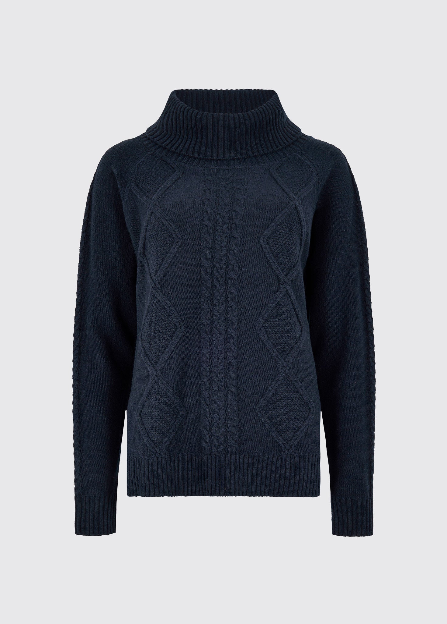 Kirkwood women’s chunky sweater with intricate cable stitch in navy