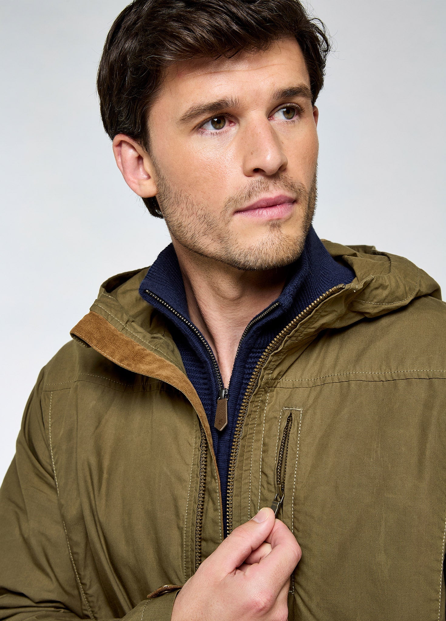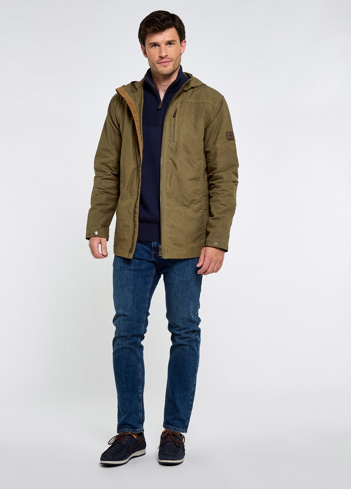 A contemporary take on a wax cotton coat, the Larkfield jacket has a sporty feel with a fixed hood and zipped pockets. A chunky metal front zip and branded leather badge stay true to a rugged, outdoorsy look while the drawcord hem and adjustable cuff tabs allow for individual styling. Made from a unique Scottish-woven waxed cotton that is air tumbled after the emulsified wax treatment to leave a soft, weathered, dry finish that will not transfer wax and allows us to construct this jacket unlined for lightweight, breathable performance.