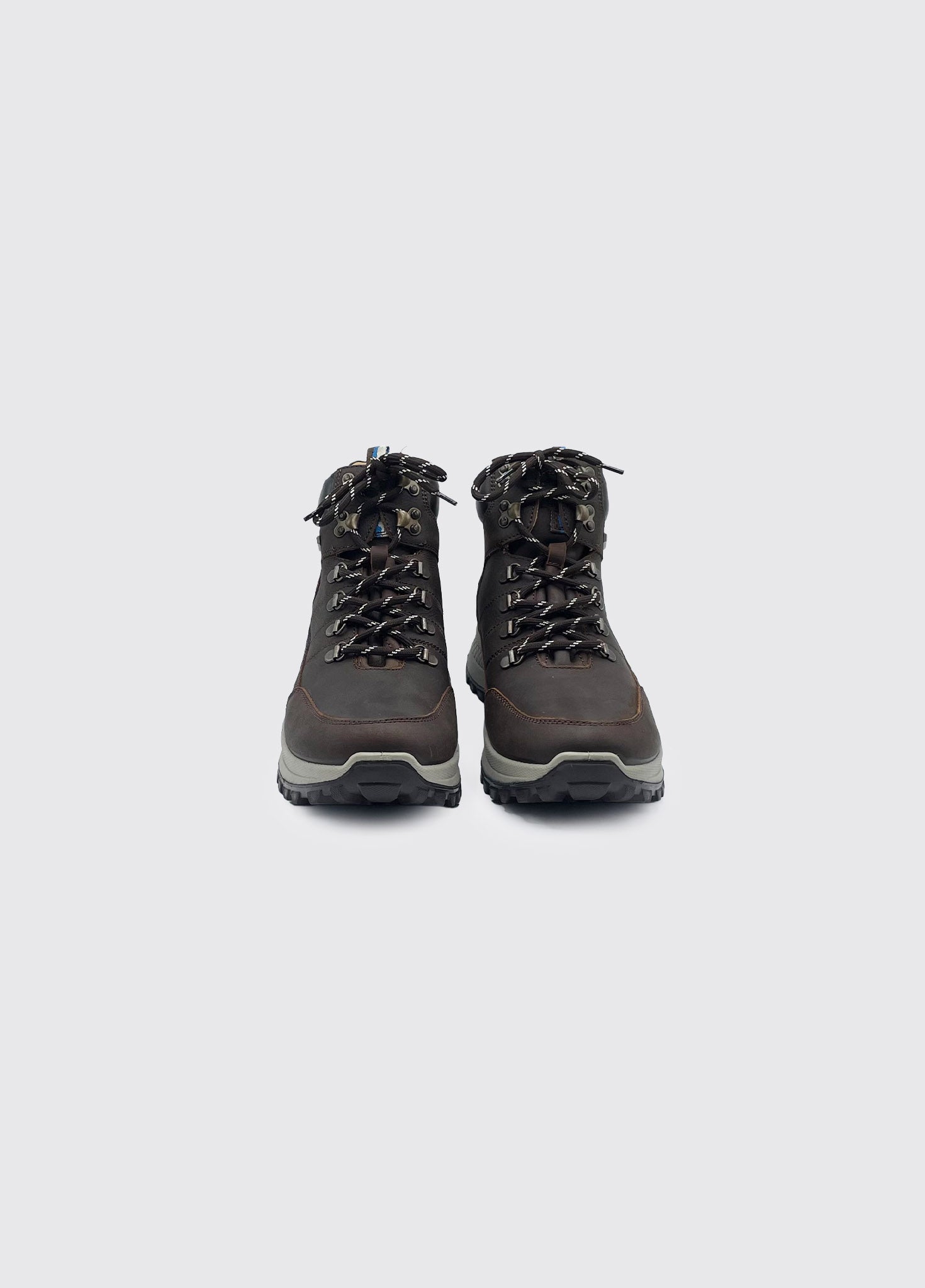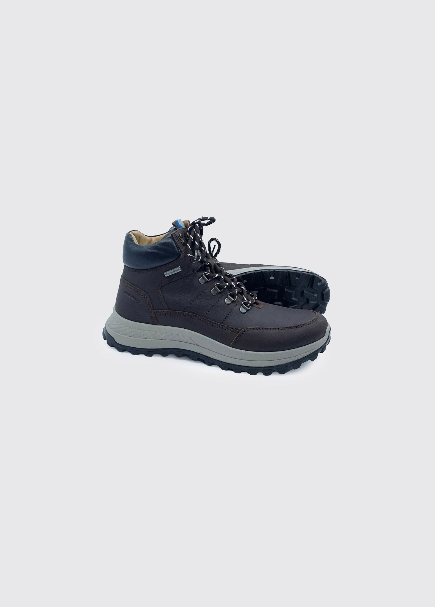 The Alaska java waterproof hiking boot features a lace-up closure with four eyelets for a secure fit. It includes a shoe tongue finger pull for easy adjustment and a high ankle design for added support. The boot is constructed with a Sympatax upper and equipped with a durable TPR sole, offering reliable traction and protection on rugged terrain.