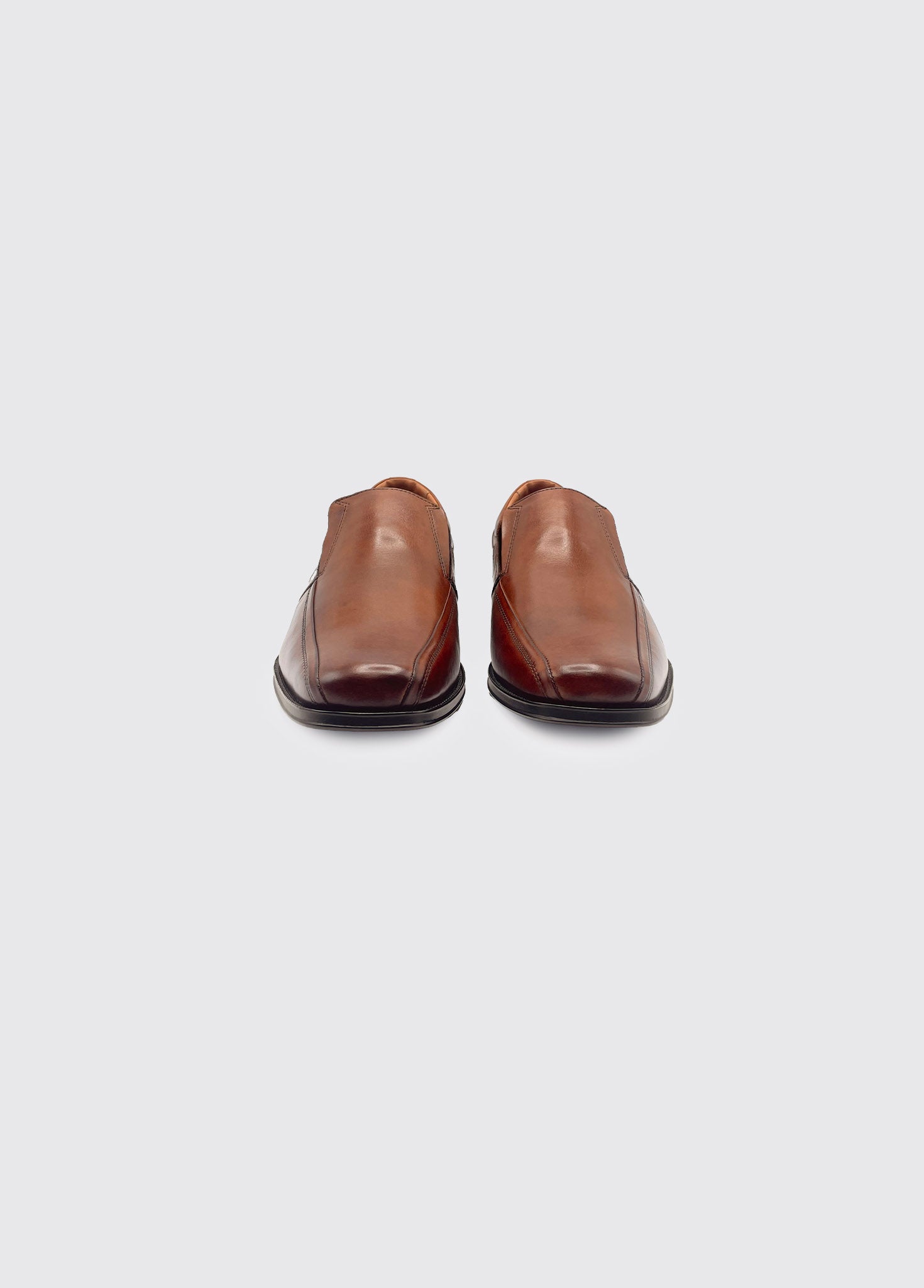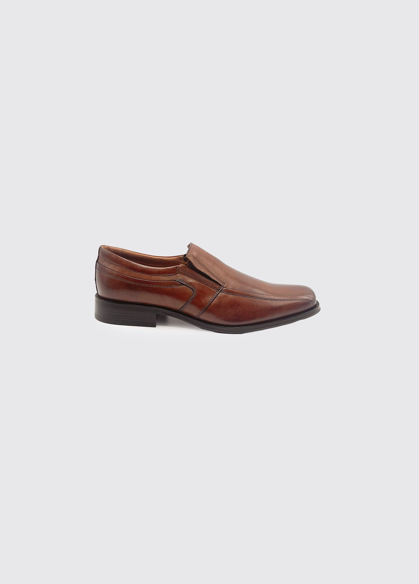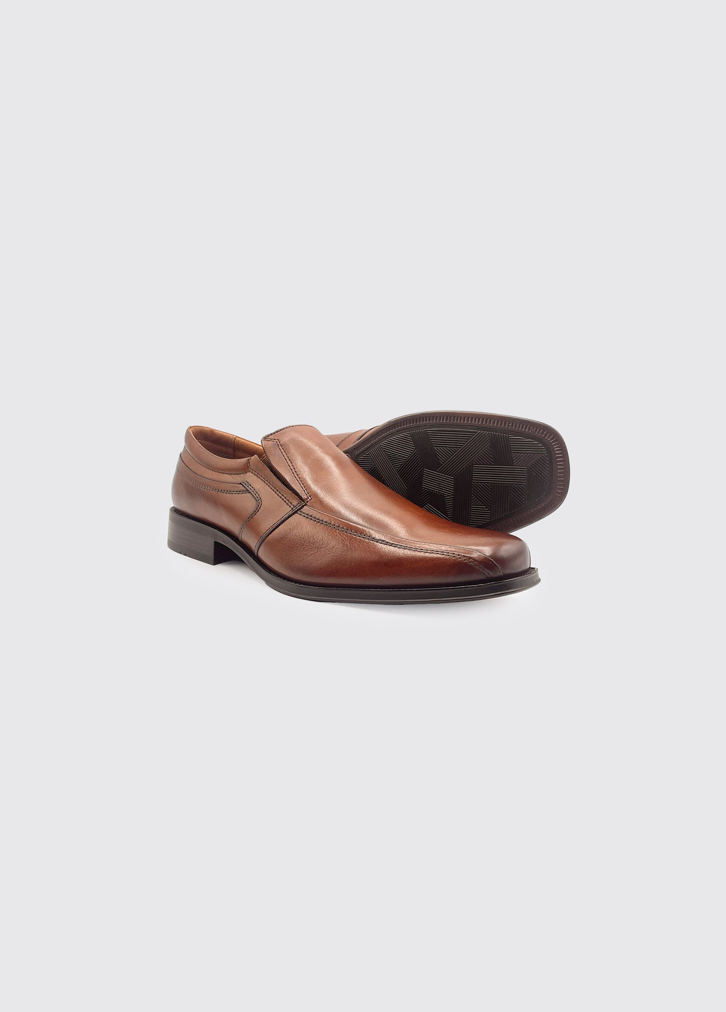 The Declan Black Shoe features an easy slip on design with twin elastic gusset for a secure fit, complemented by tramline stitch detailing for a touch of sophistication. This shoe is both comfortable and stylish, ideal for everyday wear.