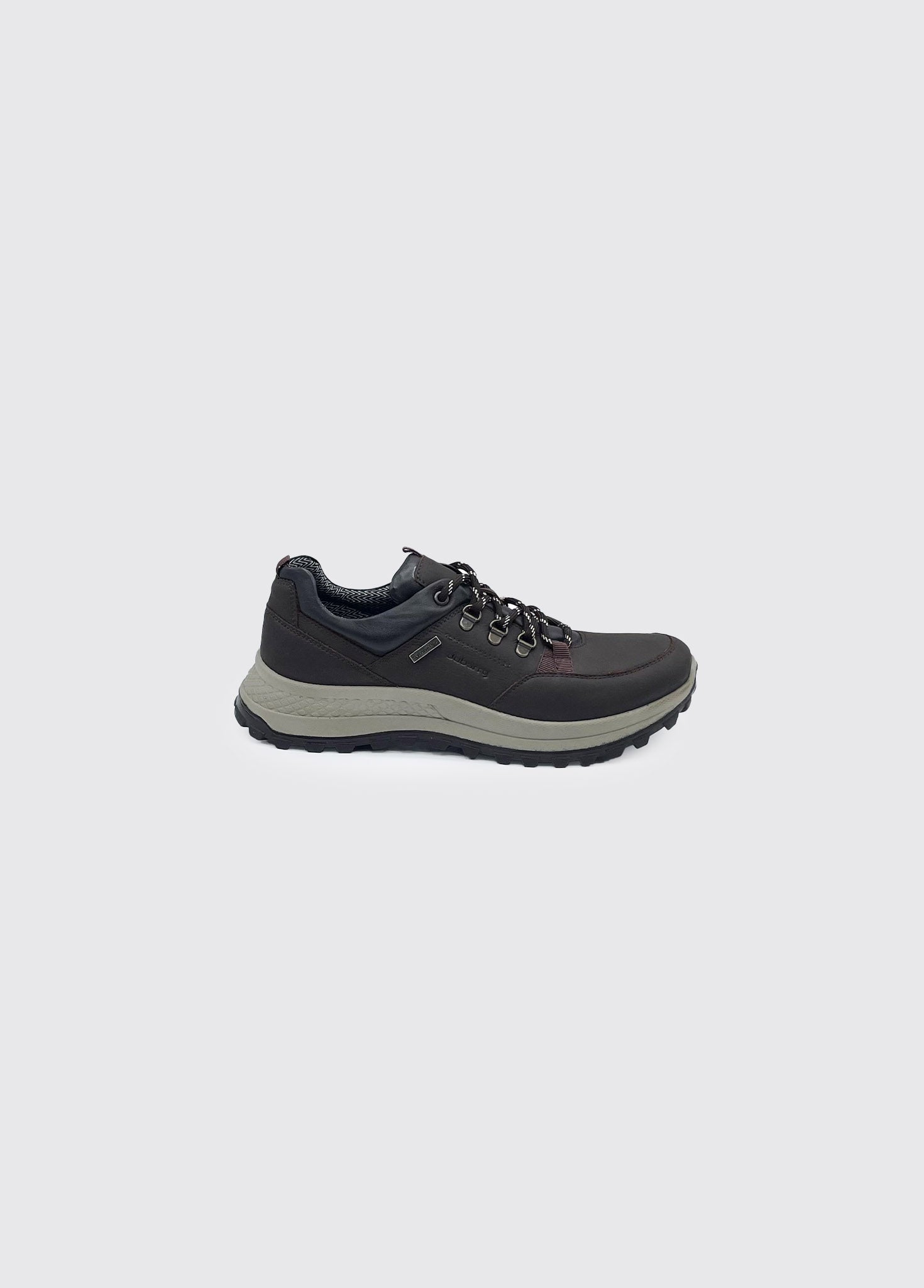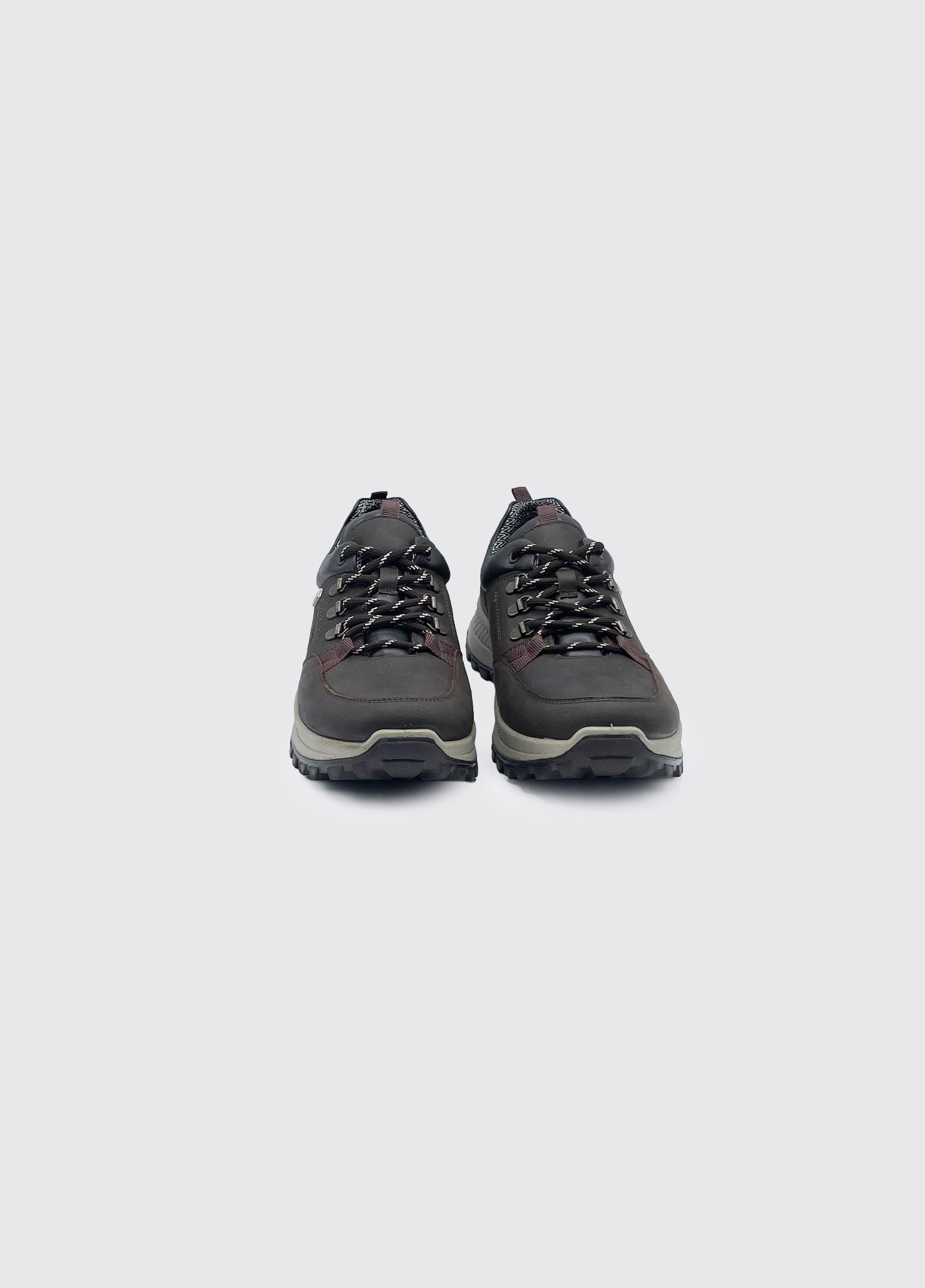 The Kansas - Java hiking shoe features a waterproof Sympatex upper that protects you from the elements while maintaining breathability. Its lace-up closure with four eye ties ensures a secure fit, complemented by a heel finger pull for easy on and off. The durable TPR sole provides reliable traction on various terrains, making it a practical choice for outdoor adventures.