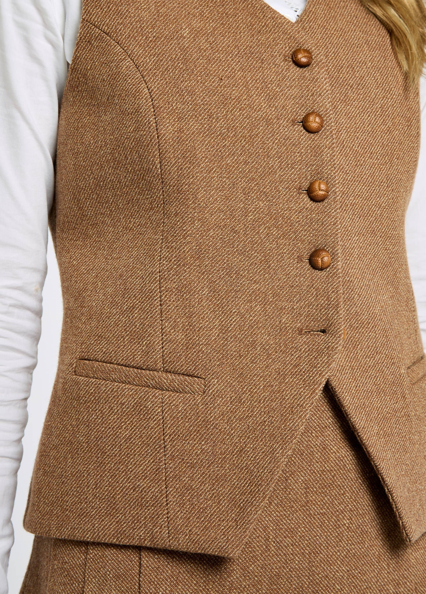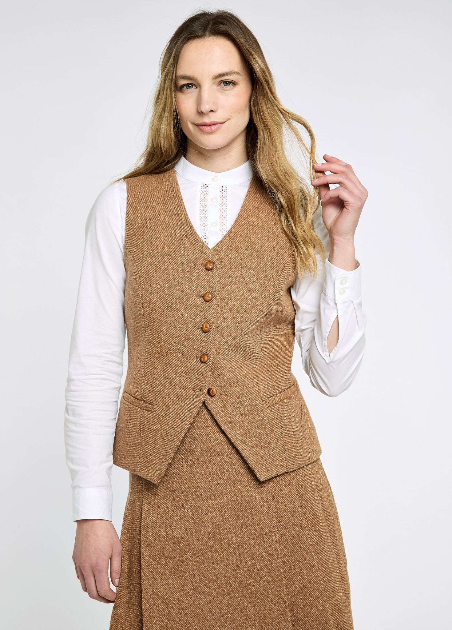 Made in a bespoke Dubarry tweed our Robinswood waistcoats are a flattering addition to your wardrobe ideal for transitioning through seasons. The soft, tailored wool is closely fitted and cut away at the front for an elegant silhouette. A perfect autumnal outer layer or a warming winter underlayer, beautifully matched with your tweed jacket.
