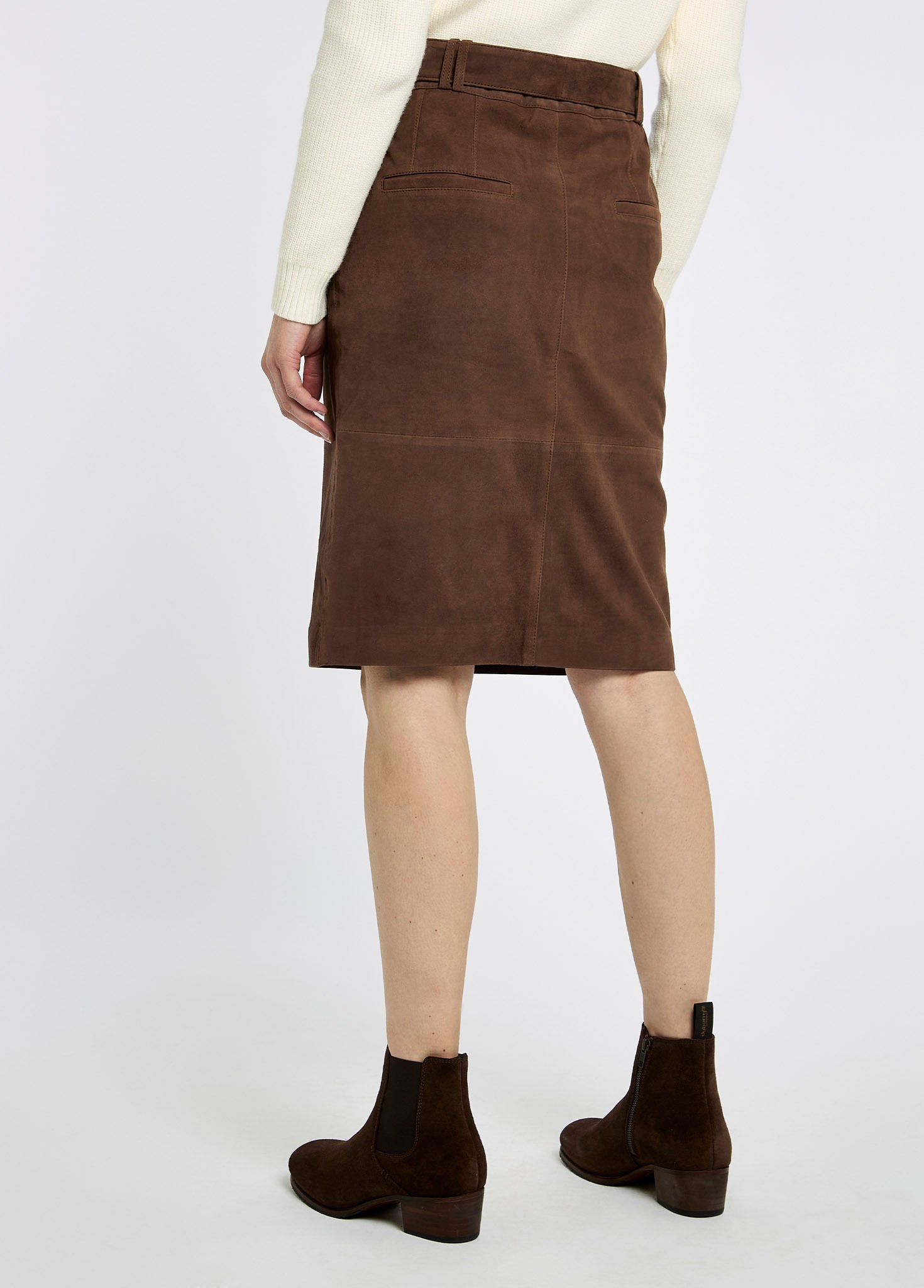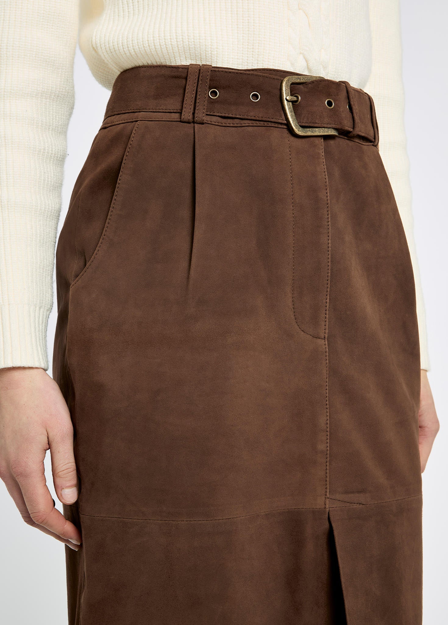 A beautiful investment piece, our Sullivan knee length skirt will be with you for years. Soft walnut goat suede is fully lined and features front pleats for a comfortable fit. Pockets add a relaxed touch to this sophisticated skirt which can be dressed up or down with your favourite shirting or knitwear.