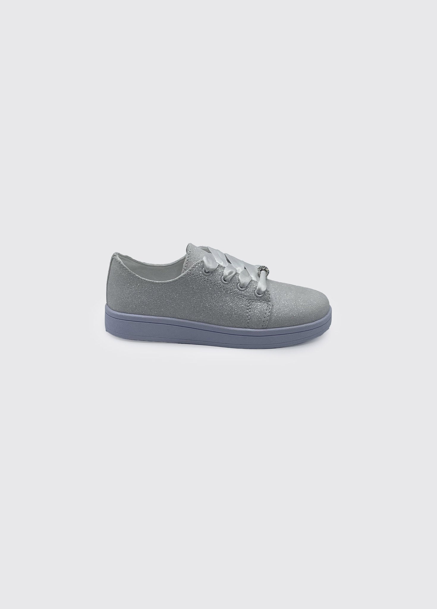 The Valerie Girls Trainer Communion Shoe in white features a glitter leather upper for a shimmery look. It has a 4 eye-tie design with satin laces accented by a silver charm, adding a subtle decorative touch. The rubber outsole provides durable traction, making it suitable for both special occasions and comfortable wear.