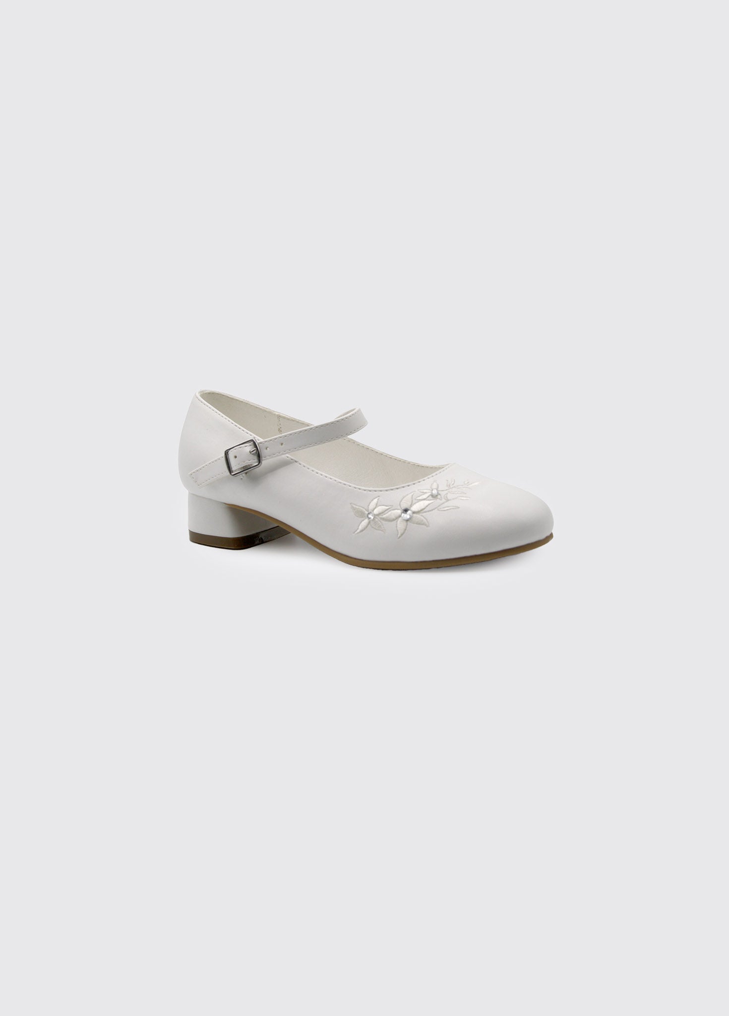 The Vicky Girls Communion Shoe in white leather showcases a single buckle closure, adorned with a subtle flower accent and a small raised heel for refined comfort.